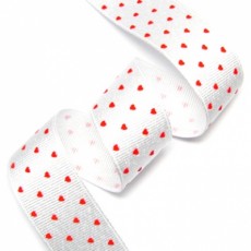 환타색 골지리본에 흰색 하트 프린트된 리본입니다.