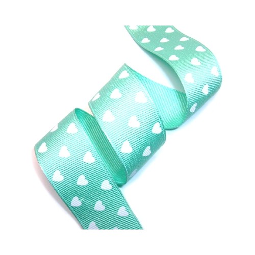 민트색 골지리본에 흰색 하트 프린트된 리본입니다.